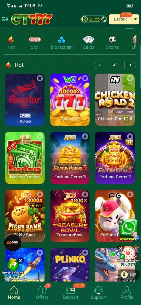 - Select a Game – Choose from available games such as slots, color prediction, or cards.